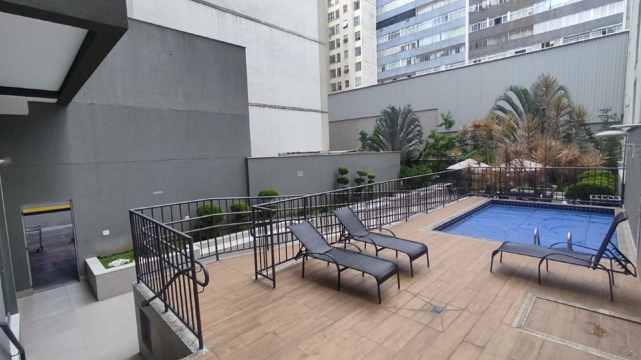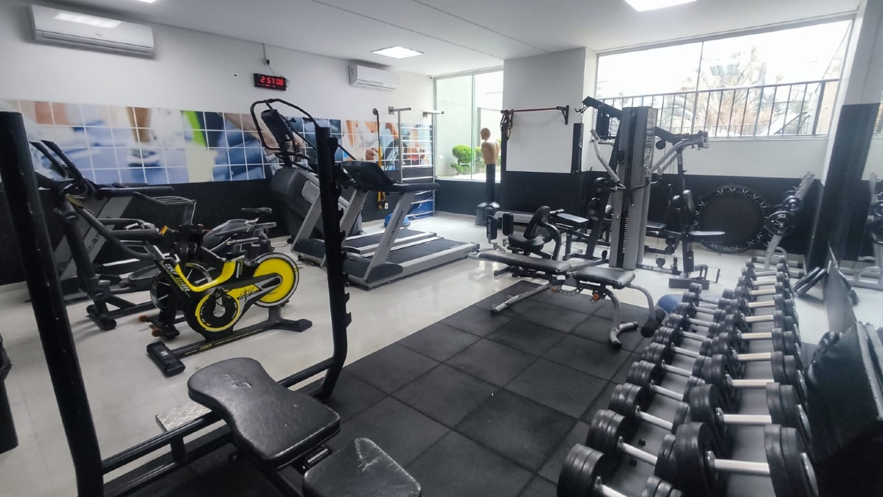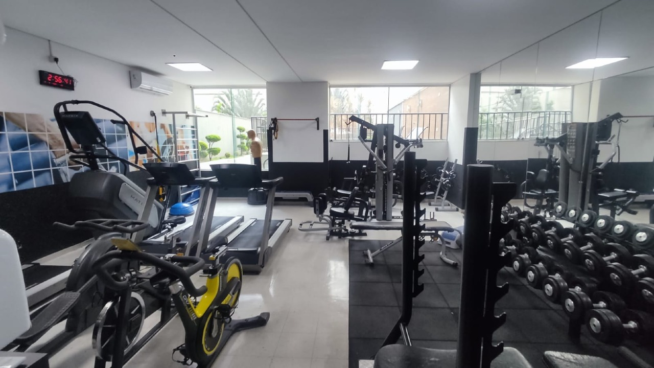 Lazer com academia, sauna, piscina, área livre, salão de festas.